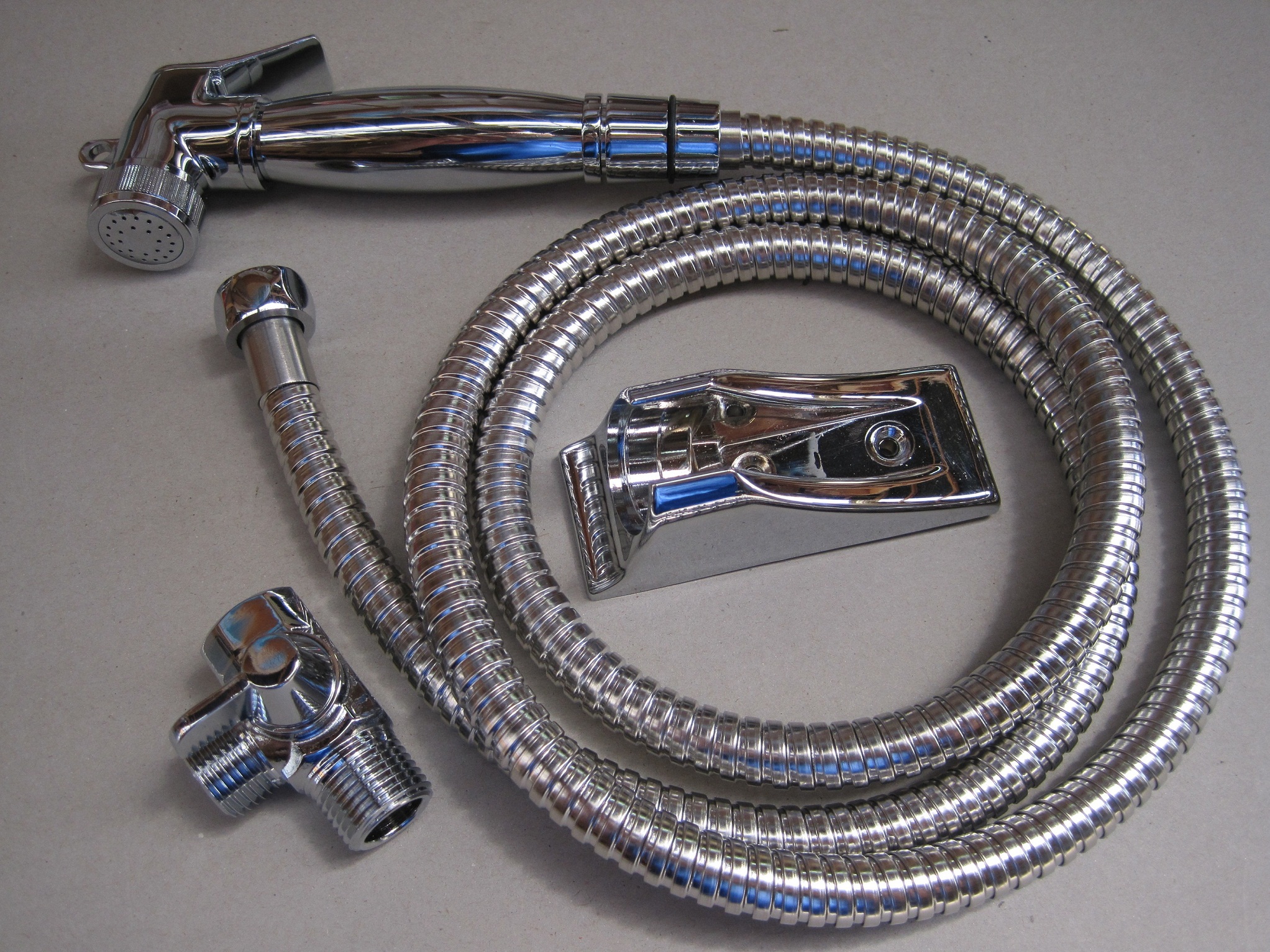 BIDET SPRAY SET. 1500mm chrome metal hose and trigger spray head. Chrome wall bracket. Diverter valve to switch between using the spray and filling the cistern. This avoids any accidental triggering when not in use.